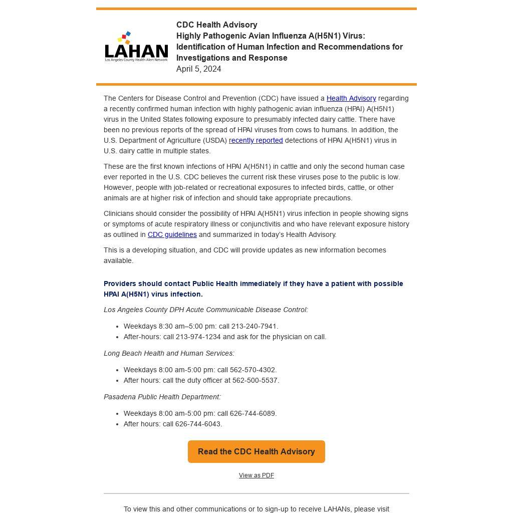 Providers should contact Public Health immediately if they have a patient with possible HPAI A(H5N1) virus infection.
