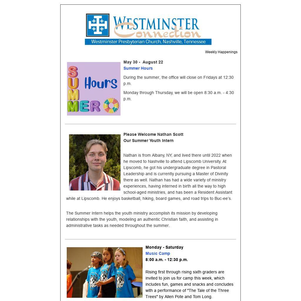The Summer Intern helps the youth ministry accomplish its mission by developing relationships with the youth, modeling an authentic Christian faith, and assisting in administrative tasks as needed throughout the summer.