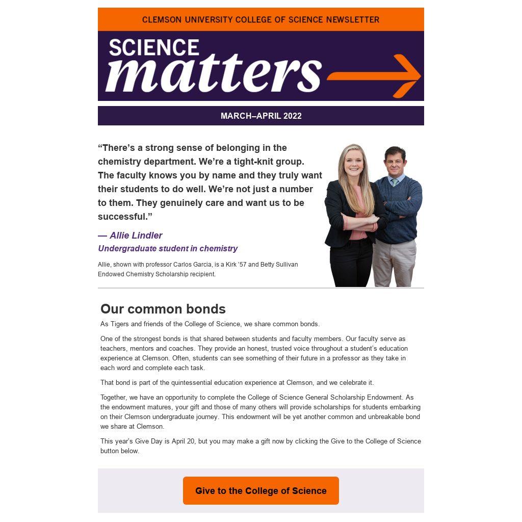 Together, we have an opportunity to complete the College of Science General Scholarship Endowment. As the endowment matures, your gift and those of many others will provide scholarships for students embarking on their Clemson undergraduate journey. This endowment will be yet another common and unbreakable bond we share at Clemson.
