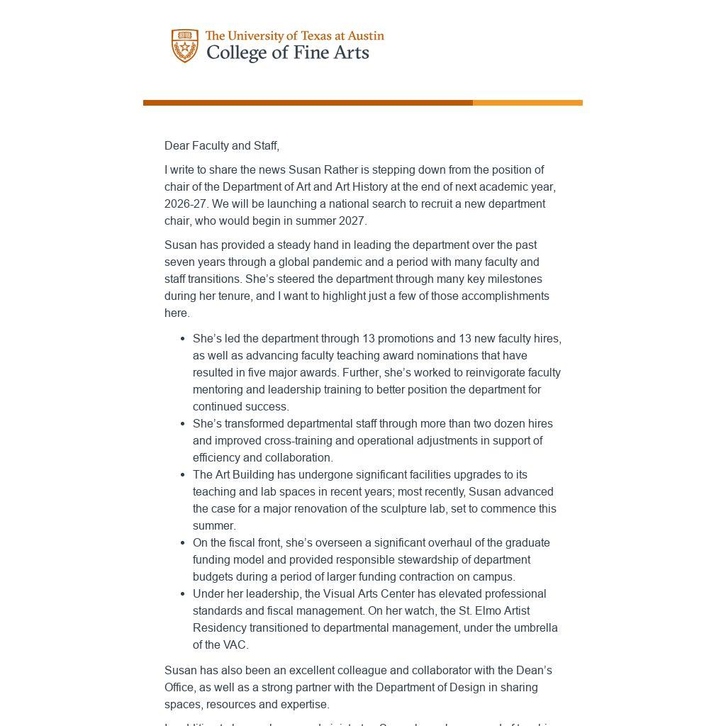 I write to share the news Susan Rather is stepping down from the position of chair of the Department of Art and Art History at the end of next academic year, 2026-27. We will be launching a national search to recruit a new department chair, who would begin in summer 2027.