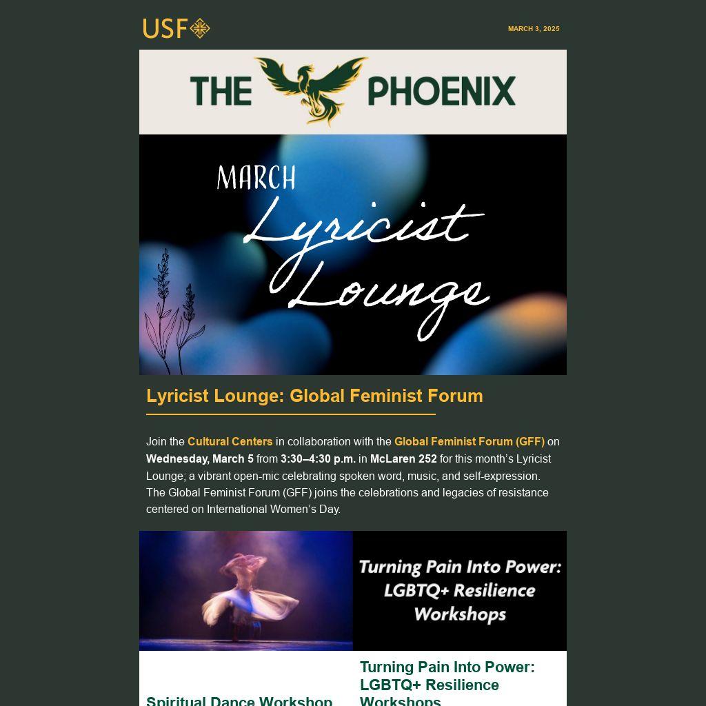 The Phoenix is a weekly e-newsletter sent by Student Leadership and Engagement to help students stay connected and get involved. It features campus events, leadership opportunities, athletic games, workshops, retreats, and more. Why “The Phoenix” title? The Phoenix has long been associated with the history and growth of USF as well as St. Ignatius, who encouraged followers to “go forth and set the world on fire.” Learn more »