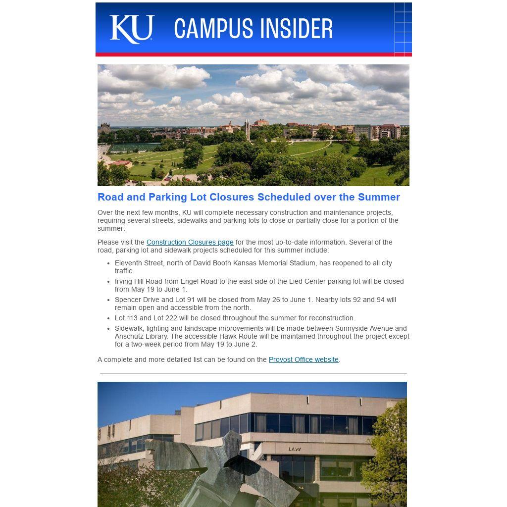 Over the next few months, KU will complete necessary construction and maintenance projects, requiring several streets, sidewalks and parking lots to close or partially close for a portion of the summer.