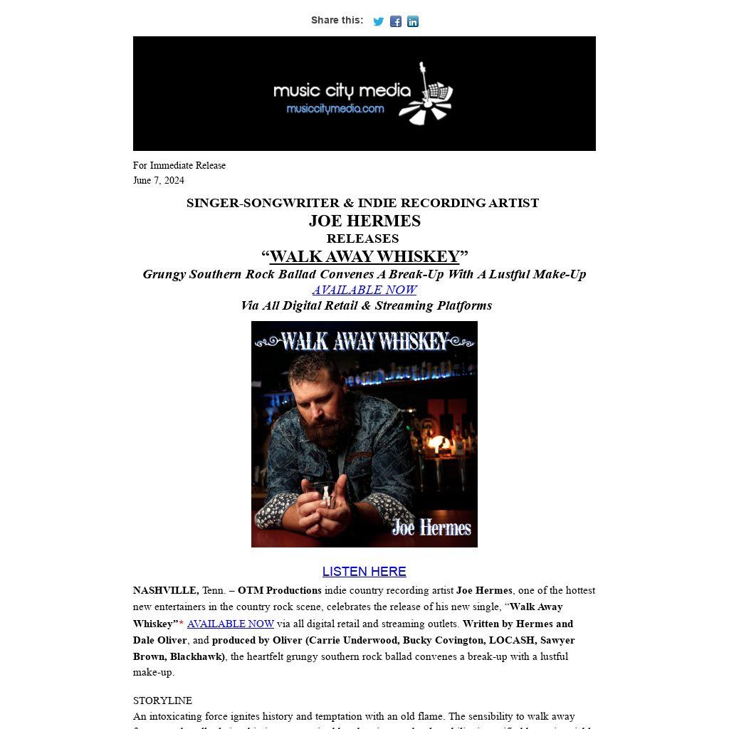 The release of “Walk Away Whiskey” (available worldwide via all major digital retail and streaming platforms on Friday, May 24, 2024, with the presale/pre-save event beginning May 24) is in keeping with Hermes' swift momentum in the country music arena. The two new singles, “Baptized By The South” and “Walk Away Whiskey” are the first in Hermes’ 2024 Waterfall Series leading to a CD release anticipated in late fall 2024. The lead single, “Baptized By The South,” is approaching 89.5K streams since the March 2024 release.