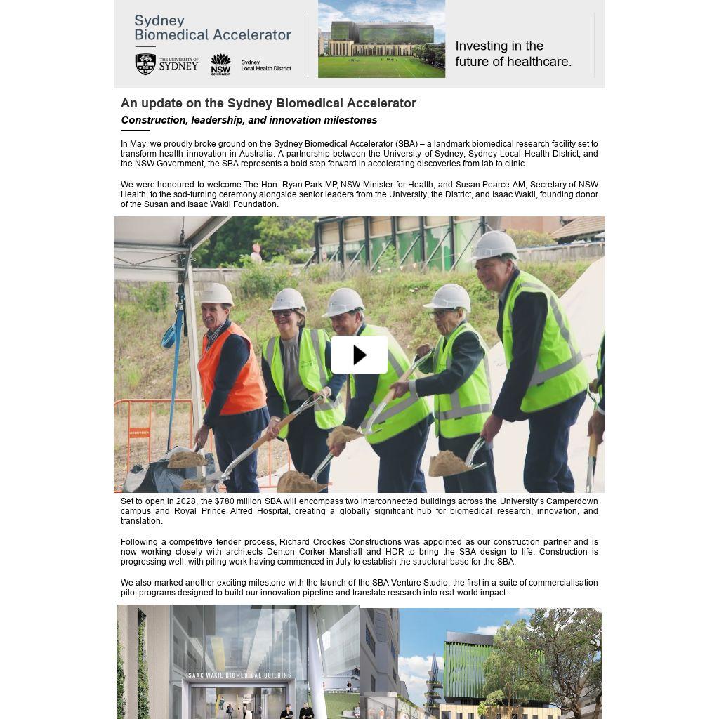 In May, we proudly broke ground on the Sydney Biomedical Accelerator (SBA) – a landmark biomedical research facility set to transform health innovation in Australia. A partnership between the University of Sydney, Sydney Local Health District, and the NSW Government, the SBA represents a bold step forward in accelerating discoveries from lab to clinic.