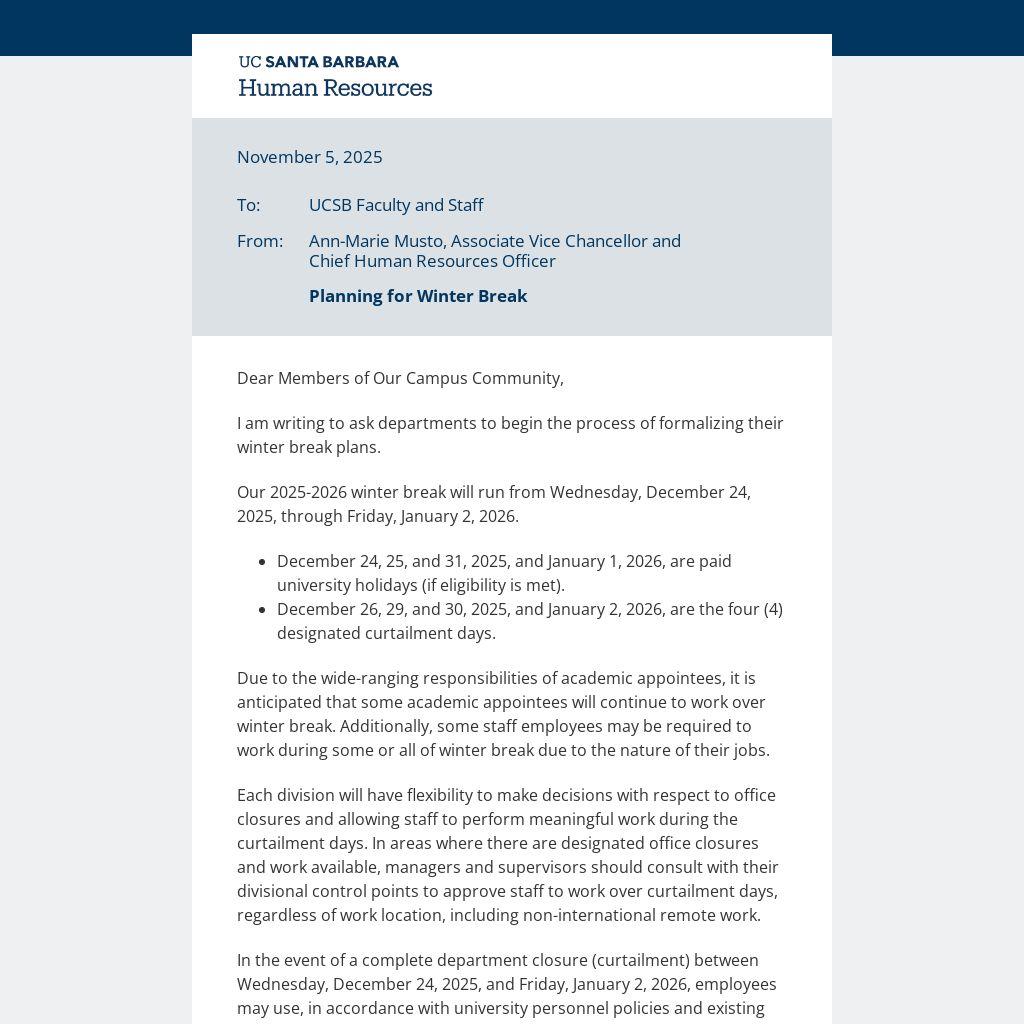 I am writing to ask departments to begin the process of formalizing their winter break plans.