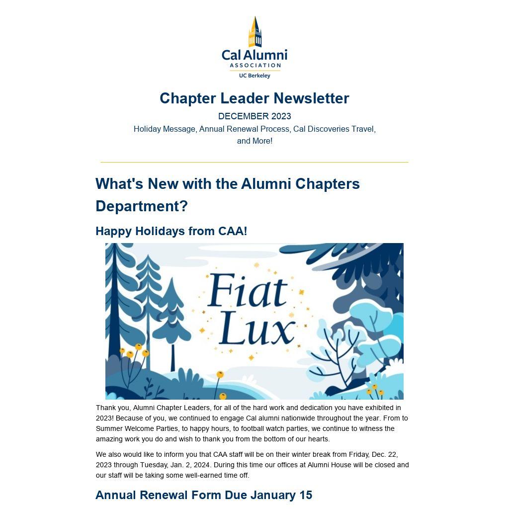 We also would like to inform you that CAA staff will be on their winter break from Friday, Dec. 22, 2023 through Tuesday, Jan. 2, 2024. During this time our offices at Alumni House will be closed and our staff will be taking some well-earned time off.