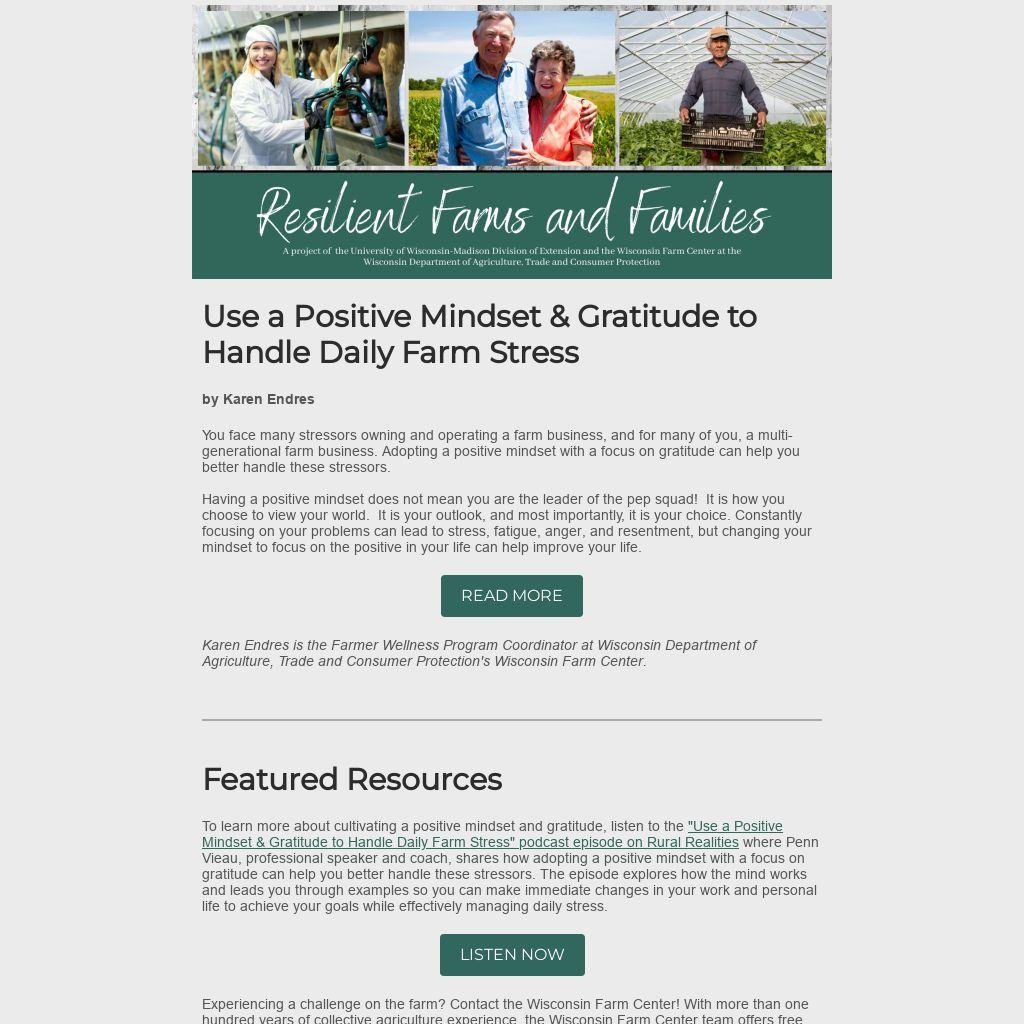 To learn more about cultivating a positive mindset and gratitude, listen to the "Use a Positive Mindset & Gratitude to Handle Daily Farm Stress" podcast episode on Rural Realities where Penn Vieau, professional speaker and coach, shares how adopting a positive mindset with a focus on gratitude can help you better handle these stressors. The episode explores how the mind works and leads you through examples so you can make immediate changes in your work and personal life to achieve your goals while effectively managing daily stress.