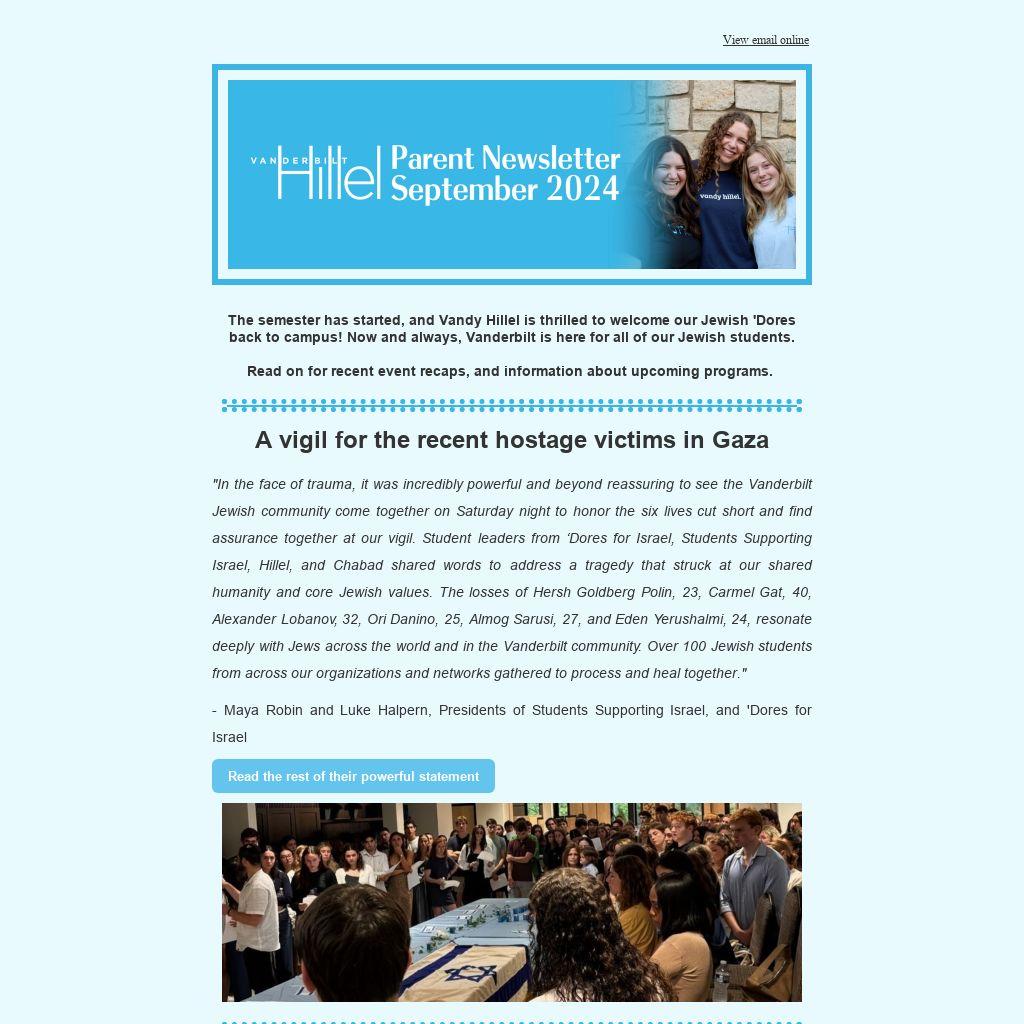 "In the face of trauma, it was incredibly powerful and beyond reassuring to see the Vanderbilt Jewish community come together on Saturday night to honor the six lives cut short and find assurance together at our vigil. Student leaders from ‘Dores for Israel, Students Supporting Israel, Hillel, and Chabad shared words to address a tragedy that struck at our shared humanity and core Jewish values. The losses of Hersh Goldberg Polin, 23, Carmel Gat, 40, Alexander Lobanov, 32, Ori Danino, 25, Almog Sarusi, 27, and Eden Yerushalmi, 24, resonate deeply with Jews across the world and in the Vanderbilt community. Over 100 Jewish students from across our organizations and networks gathered to process and heal together."