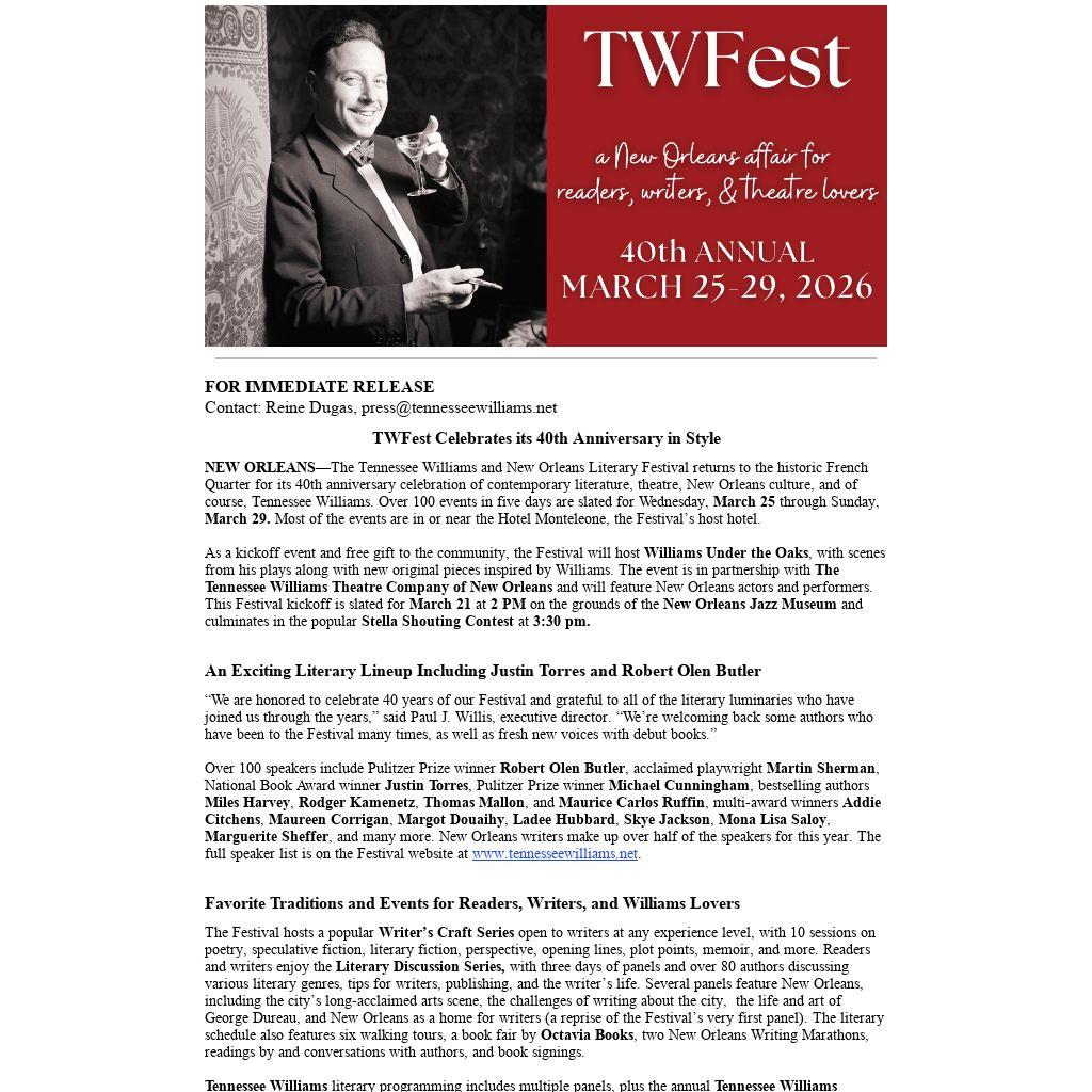 Festival passes are on sale now, and individual event tickets go on sale soon. Prices for most individual events range from $10 to $45. For more information, visit tennesseewilliams.net. Find us on Facebook, Bluesky, and Instagram @TWFestNOLA.