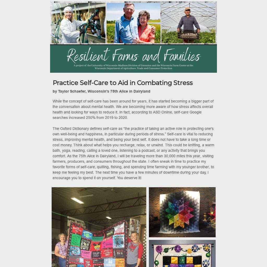 The Oxford Dictionary defines self-care as “the practice of taking an active role in protecting one's own well-being and happiness, in particular during periods of stress.” Self-care is vital to reducing stress, improving mental health, and being your best self. It does not have to take a long time or cost money. Think about what helps you recharge, relax, or unwind. This could be knitting, a warm bath, yoga, reading, calling a loved one, listening to a podcast, or any activity that brings you comfort. As the 75th Alice in Dairyland, I will be traveling more than 30,000 miles this year, visiting farmers, producers, and consumers throughout the state. I often sneak in time to practice my favorite forms of self-care, quilting, fishing, and spending time farming with my younger brother, to keep me feeling my best. The next time you have a few minutes of downtime during your day, I encourage you to spend it on yourself. You deserve it!