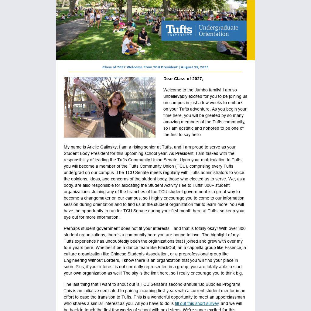 My name is Arielle Galinsky; I am a rising senior at Tufts, and I am proud to serve as your Student Body President for this upcoming school year. As President, I am tasked with the responsibility of leading the Tufts Community Union Senate. Upon your matriculation to Tufts, you will become a member of the Tufts Community Union (TCU), comprising every Tufts undergrad on our campus. The TCU Senate meets regularly with Tufts administrators to voice the opinions, ideas, and concerns of the student body, those who elected us to serve. We, as a body, are also responsible for allocating the Student Activity Fee to Tufts' 300+ student organizations. Joining any of the branches of the TCU student government is a great way to become a changemaker on our campus, so I highly encourage you to come to our information session during orientation and to find us at the student organization fair to learn more. You will have the opportunity to run for TCU Senate during your first month here at Tufts, so keep your eye out for more information!