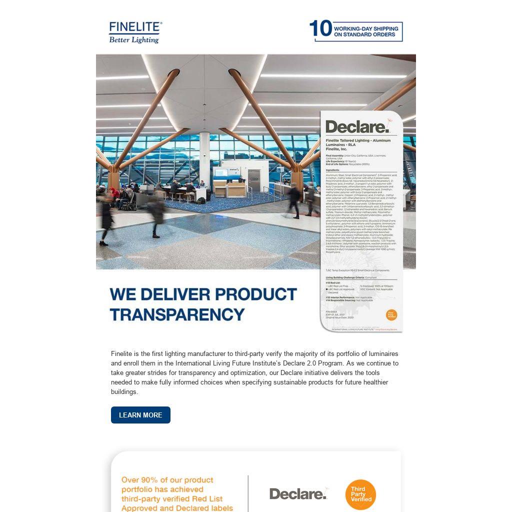 Finelite is the first lighting manufacturer to third-party verify the majority of its portfolio of luminaires and enroll them in the International Living Future Institute’s Declare 2.0 Program. As we continue to take greater strides for transparency and optimization, our Declare initiative delivers the tools needed to make fully informed choices when specifying sustainable products for future healthier buildings.