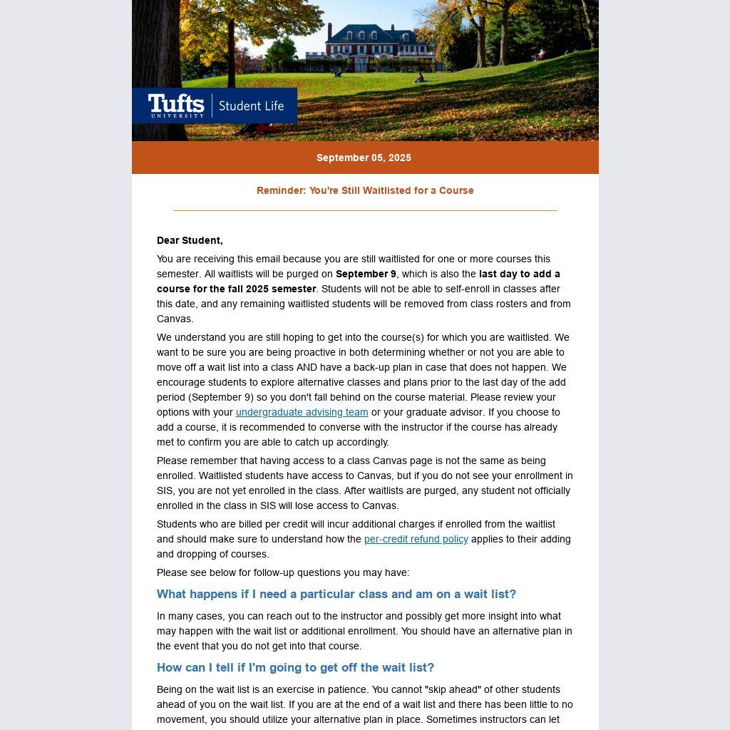 You are receiving this email because you are still waitlisted for one or more courses this semester. All waitlists will be purged on September 9, which is also the last day to add a course for the fall 2025 semester. Students will not be able to self-enroll in classes after this date, and any remaining waitlisted students will be removed from class rosters and from Canvas.