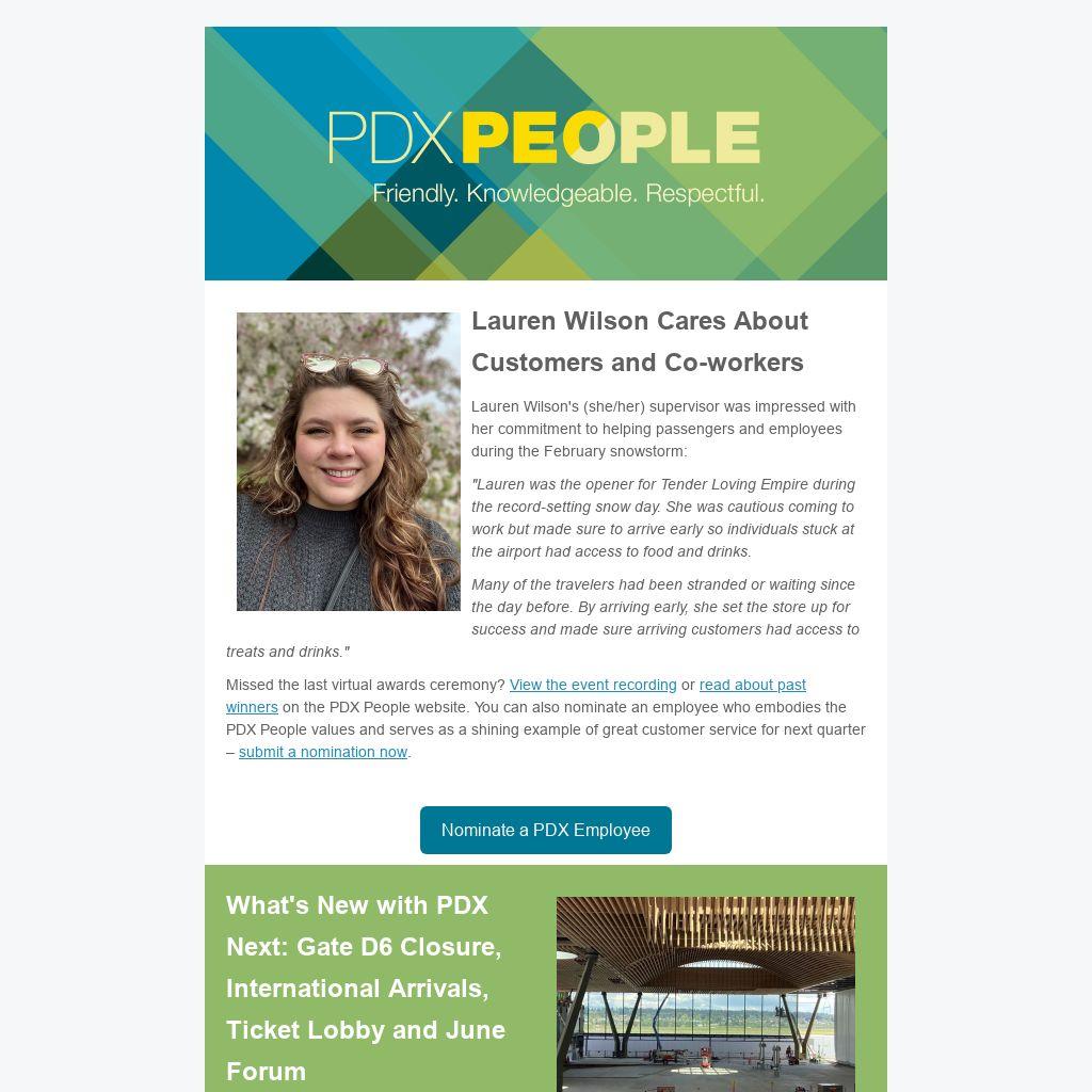 June Forum: Do you wonder what exactly the overhead work in the ticket lobby is all about or what's next for baggage claim? On Tuesday, June 27, at 10 a.m., Jen Reynolds with the Port of Portland along with Pat Bifone and Bri Leiblie of Hoffman-Skanska will share the latest construction updates, give you an early look at architectural renderings and behind-the-scenes photos and videos – all in under 30 minutes! You can call in or watch online, just email PDX People Communications before Tuesday, June 27, for the meeting link.