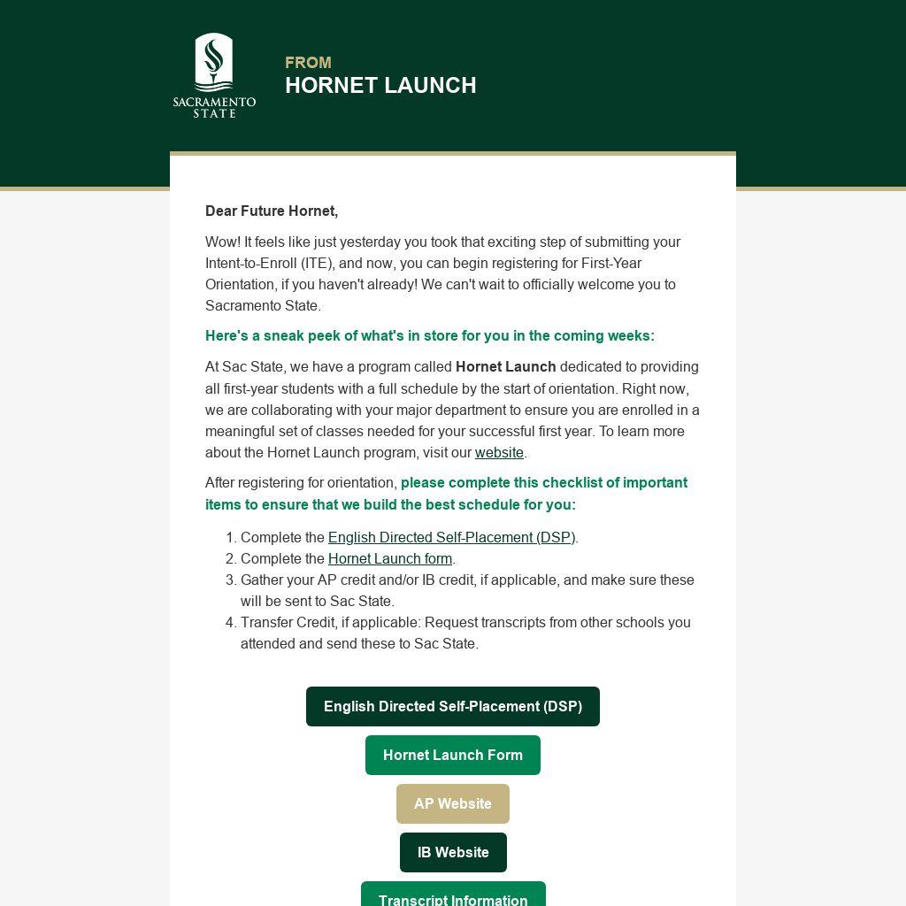 Hornet Launch dedicated to providing all first-year students with a full schedule by the start of orientation. Right now, we are collaborating with your major department to ensure you are enrolled in a meaningful set of classes needed for your successful first year. To learn more about the Hornet Launch program, visit our