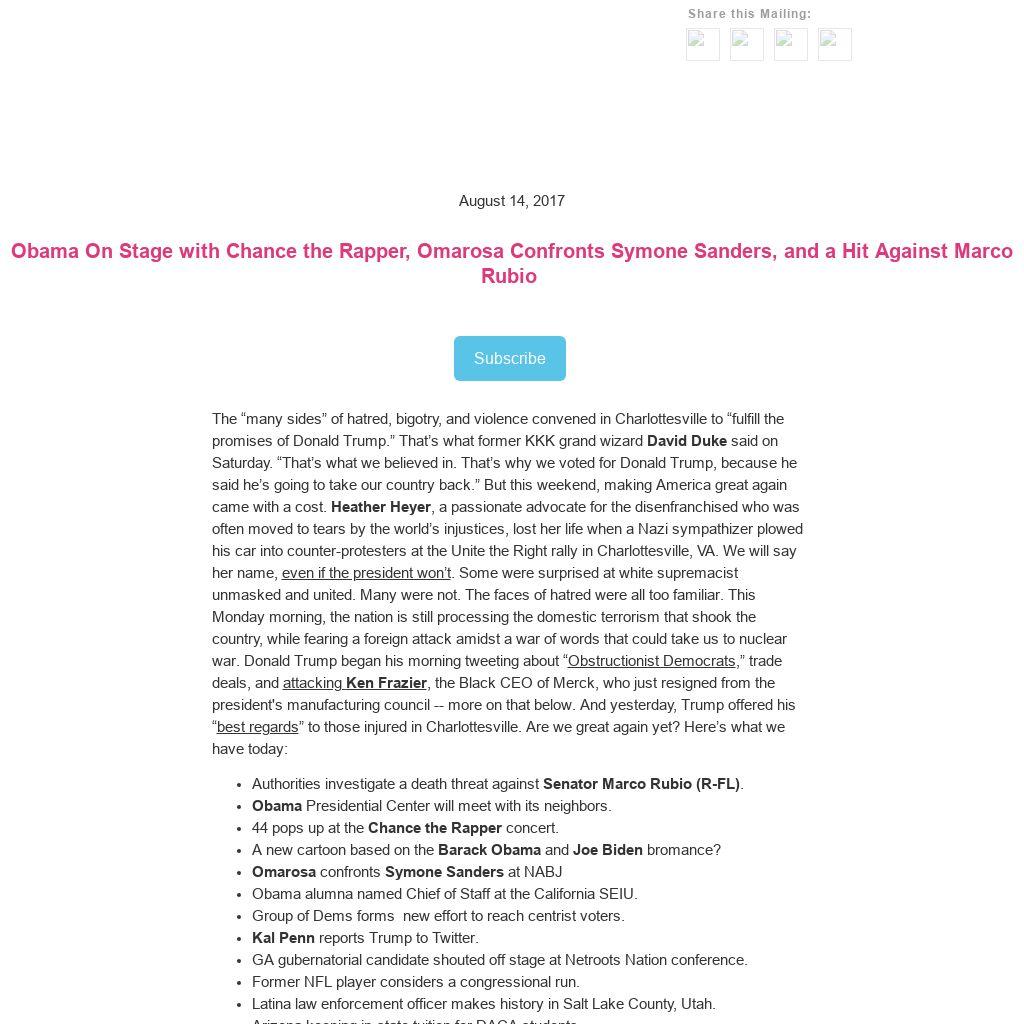 The “many sides” of hatred, bigotry, and violence convened in Charlottesville to “fulfill the promises of Donald Trump.” That’s what former KKK grand wizard David Duke said on Saturday. “That’s what we believed in. That’s why we voted for Donald Trump, because he said he’s going to take our country back.” But this weekend, making America great again came with a cost. Heather Heyer, a passionate advocate for the disenfranchised who was often moved to tears by the world’s injustices, lost her life when a Nazi sympathizer plowed his car into counter-protesters at the Unite the Right rally in Charlottesville, VA. We will say her name, even if the president won’t. Some were surprised at white supremacist unmasked and united. Many were not. The faces of hatred were all too familiar. This Monday morning, the nation is still processing the domestic terrorism that shook the country, while fearing a foreign attack amidst a war of words that could take us to nuclear war. Donald Trump began his morning tweeting about “Obstructionist Democrats,” trade deals, and attacking Ken Frazier, the Black CEO of Merck, who just resigned from the president's manufacturing council -- more on that below. And yesterday, Trump offered his “best regards” to those injured in Charlottesville. Are we great again yet? Here’s what we have today: - Authorities investigate a death threat against Senator Marco Rubio (R-FL).