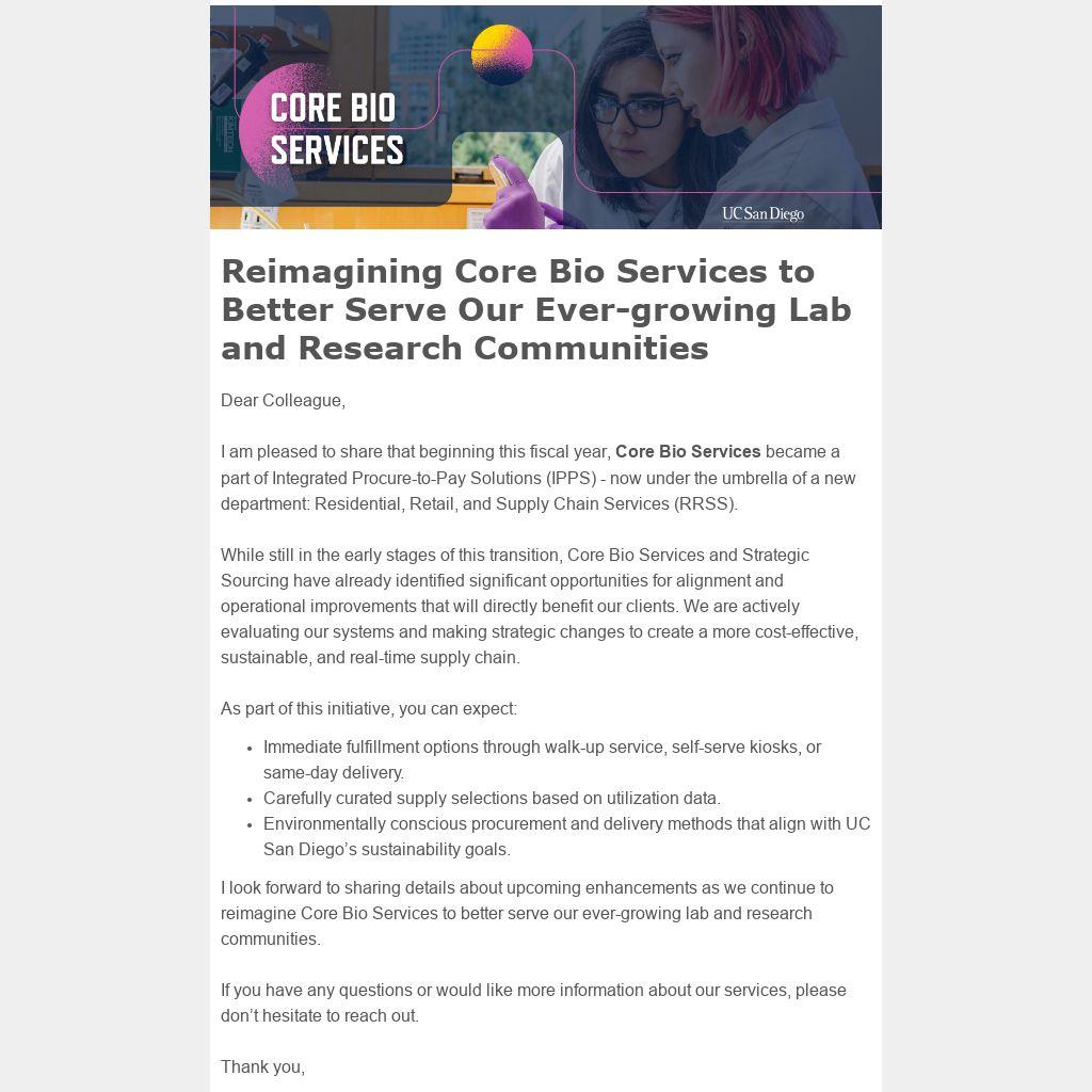 I look forward to sharing details about upcoming enhancements as we continue to reimagine Core Bio Services to better serve our ever-growing lab and research communities.