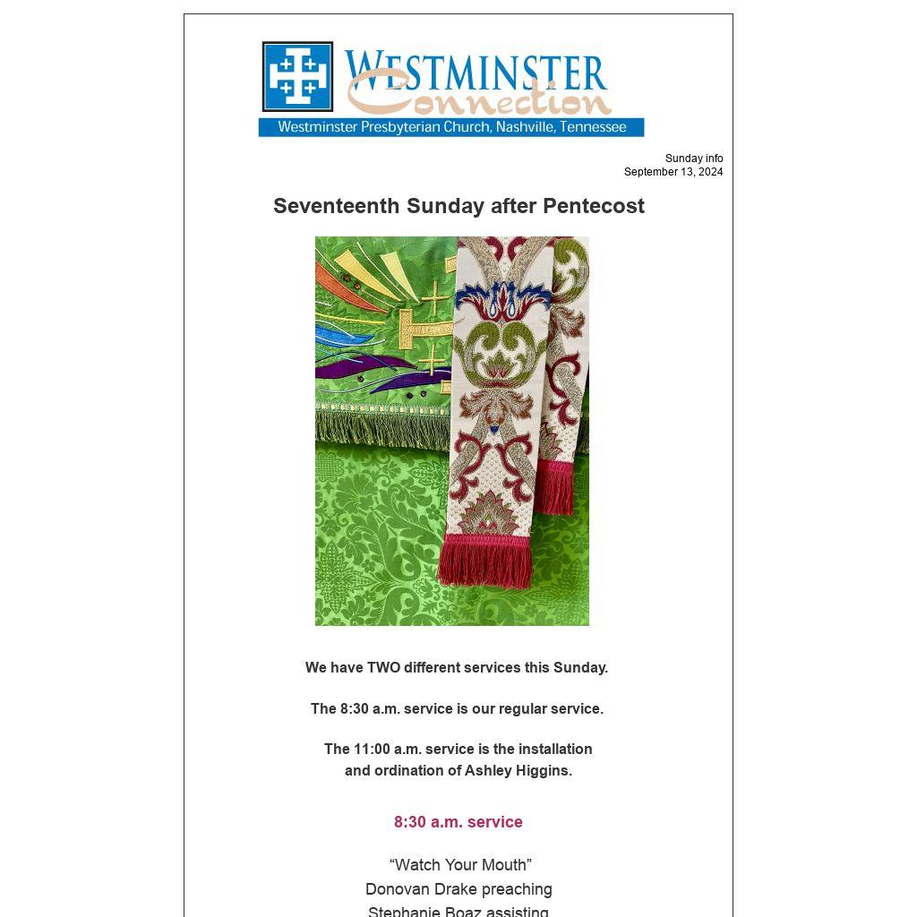 Join us at the 11:00 a.m. service to celebrate Ashley Higgins' service of ordination to the ministry of word and sacrament by the Presbytery of Middle Tennessee.