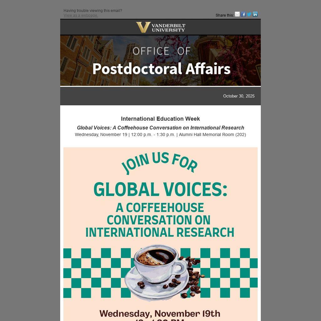 The Graduate School and Office of Postdoctoral Affairs will host Global Voices: A Coffeehouse Conversation on International Research to showcase the outstanding international research of Vanderbilt's postdoctoral scholars and graduate students. This event, part of International Education Week, will take place on Wednesday, November 19, from 12 – 1:30 p.m. in Alumni Hall Memorial Room (202).