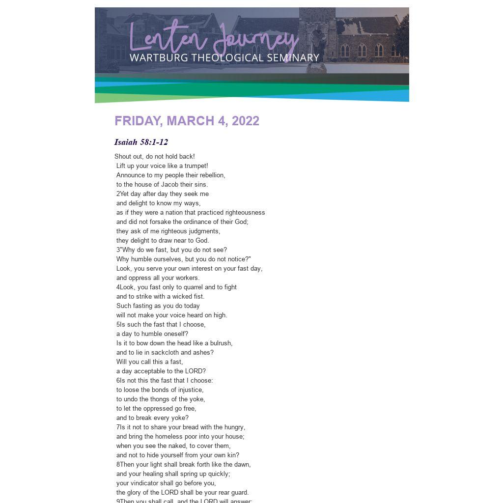 O God, help us to choose the fast that you would choose for us in order to loose the bonds of injustice, undo the thongs of the yoke, let the oppressed go free, and break every yoke.