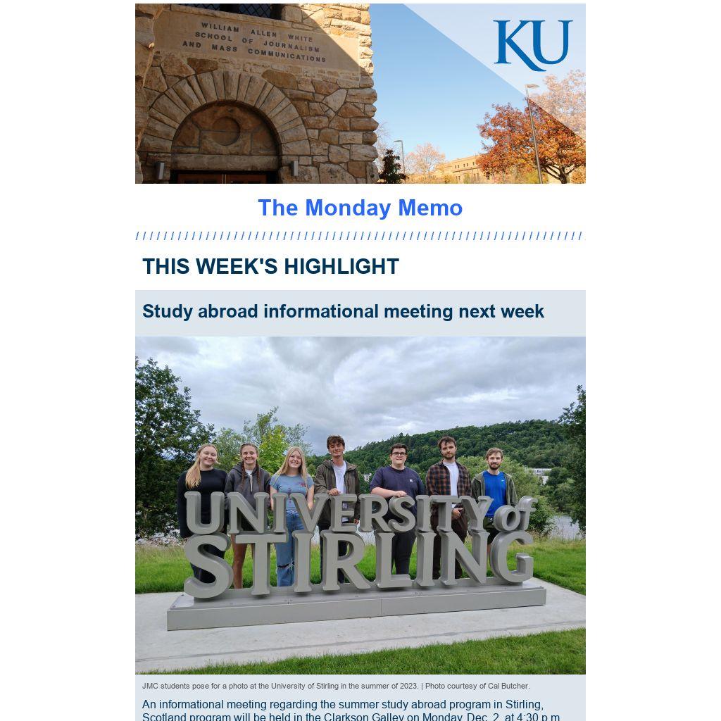 An informational meeting regarding the summer study abroad program in Stirling, Scotland program will be held in the Clarkson Galley on Monday, Dec. 2, at 4:30 p.m. Watch this video from JMC students in last summer’s program for an inside look at a day in the program.