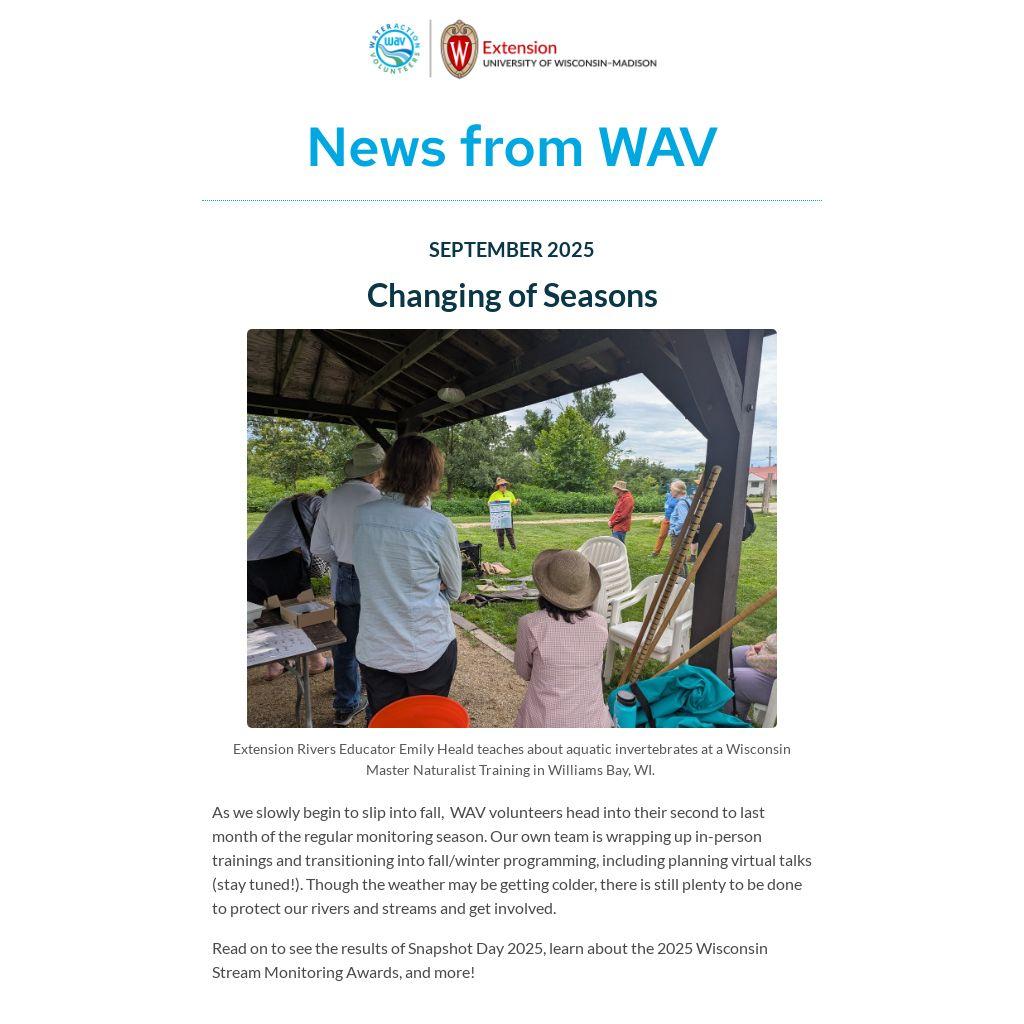 Read on to see the results of Snapshot Day 2025, learn about the 2025 Wisconsin Stream Monitoring Awards, and more!