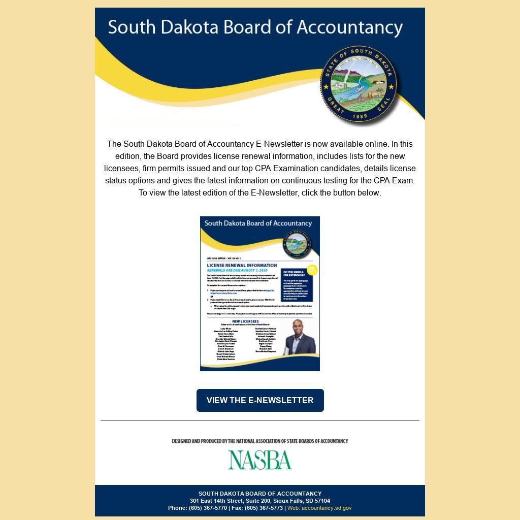 The South Dakota Board of Accountancy E-Newsletter is now available online. In this edition, the Board provides license renewal information, includes lists for the new licensees, firm permits issued and our top CPA Examination candidates, details license status options and gives the latest information on continuous testing for the CPA Exam. To view the latest edition of the E-Newsletter, click the button below.
