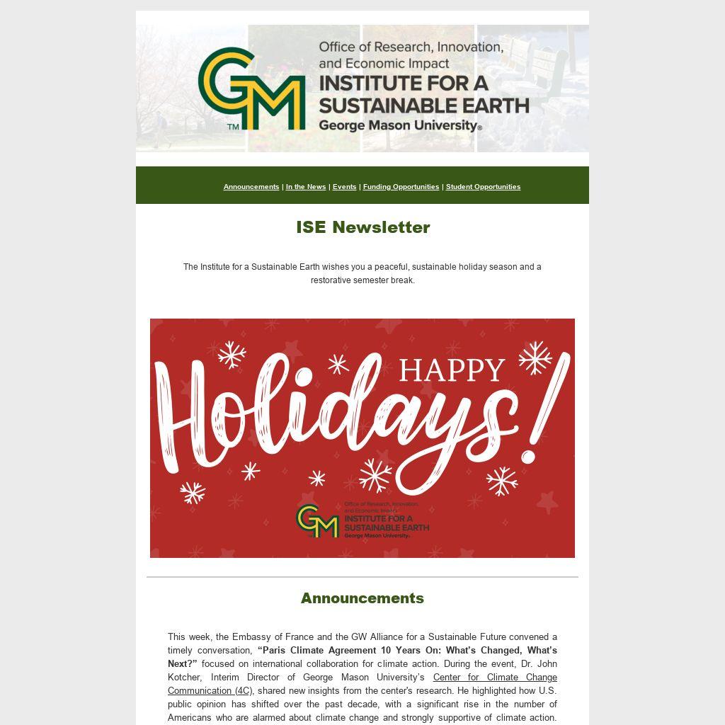The Institute for a Sustainable Earth (ISE) aims to connect members of the Mason community with others across the Mason community–and with other communities, policy-makers, businesses and organizations–so that, together, we can more effectively address the world’s pressing sustainability and resilience challenges. The ISE Newsletter provides up-to-date information on conferences, funding opportunities, and research pertaining to environmental science and sustainability. The biweekly newsletter aims to facilitate information sharing among researchers, practitioners, and relevant local, national, and international organization.