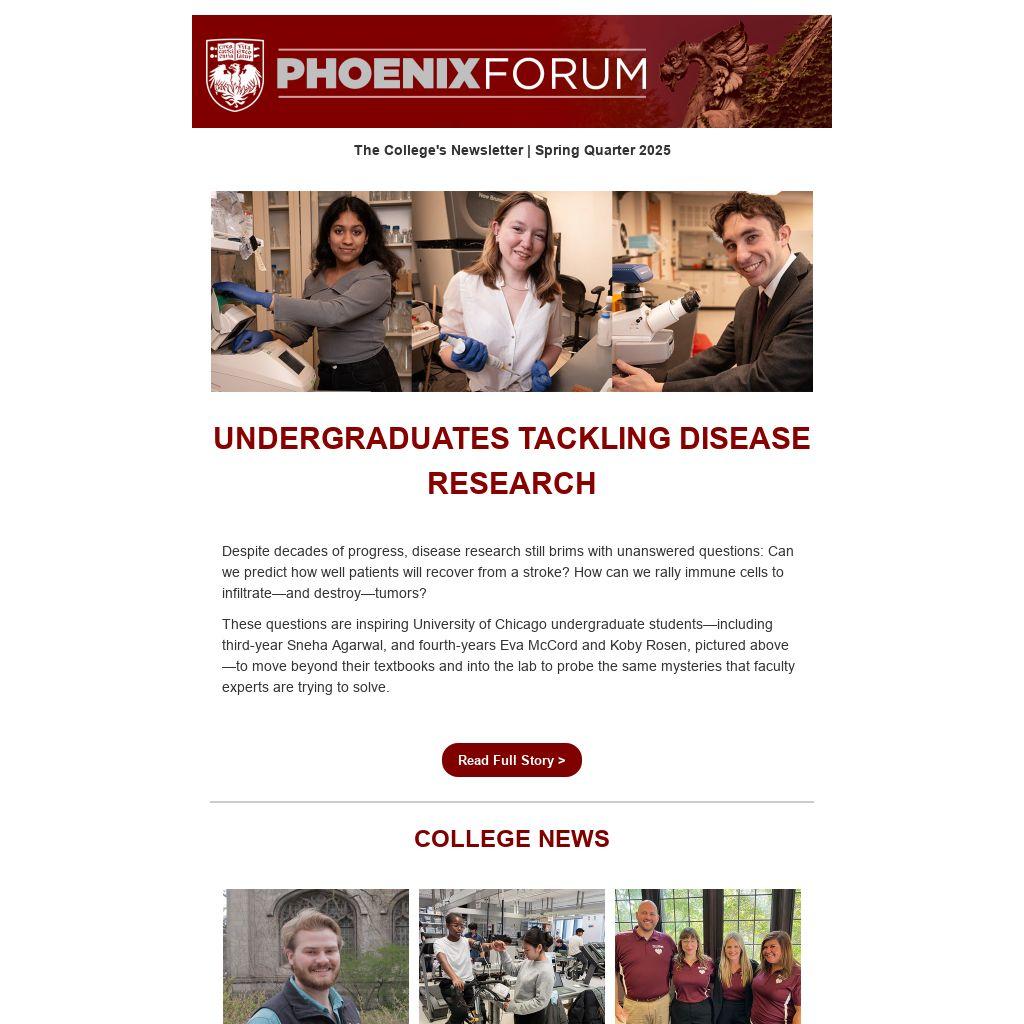 These questions are inspiring University of Chicago undergraduate students—including third-year Sneha Agarwal, and fourth-years Eva McCord and Koby Rosen, pictured above—to move beyond their textbooks and into the lab to probe the same mysteries that faculty experts are trying to solve.