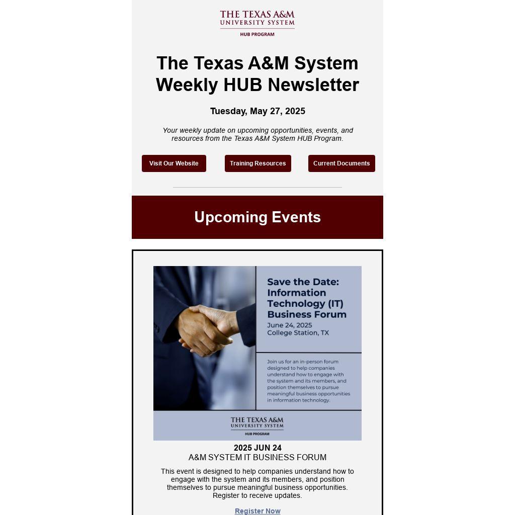 Your weekly update on upcoming opportunities, events, and resources from the Texas A&M System HUB Program.