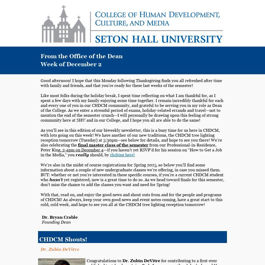 Like most folks during the holiday break, I spent time reflecting on what I am thankful for, as I spent a few days with my family enjoying some time together. I remain incredibly thankful for each and every one of you in our CHDCM community, and grateful to be serving you in my role as Dean of the College. As we enter a stressful period of exams, holiday-related errands and travel—not to mention the end of the semester crunch—I will personally be drawing upon this feeling of strong community here at SHU and in our College, and I hope you all are able to do the same!