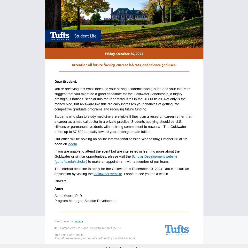 If you are unable to attend the event but are interested in learning more about the Goldwater or similar opportunities, please visit the Scholar Development website (go.tufts.edu/scholar) to make an appointment with a member of our team.