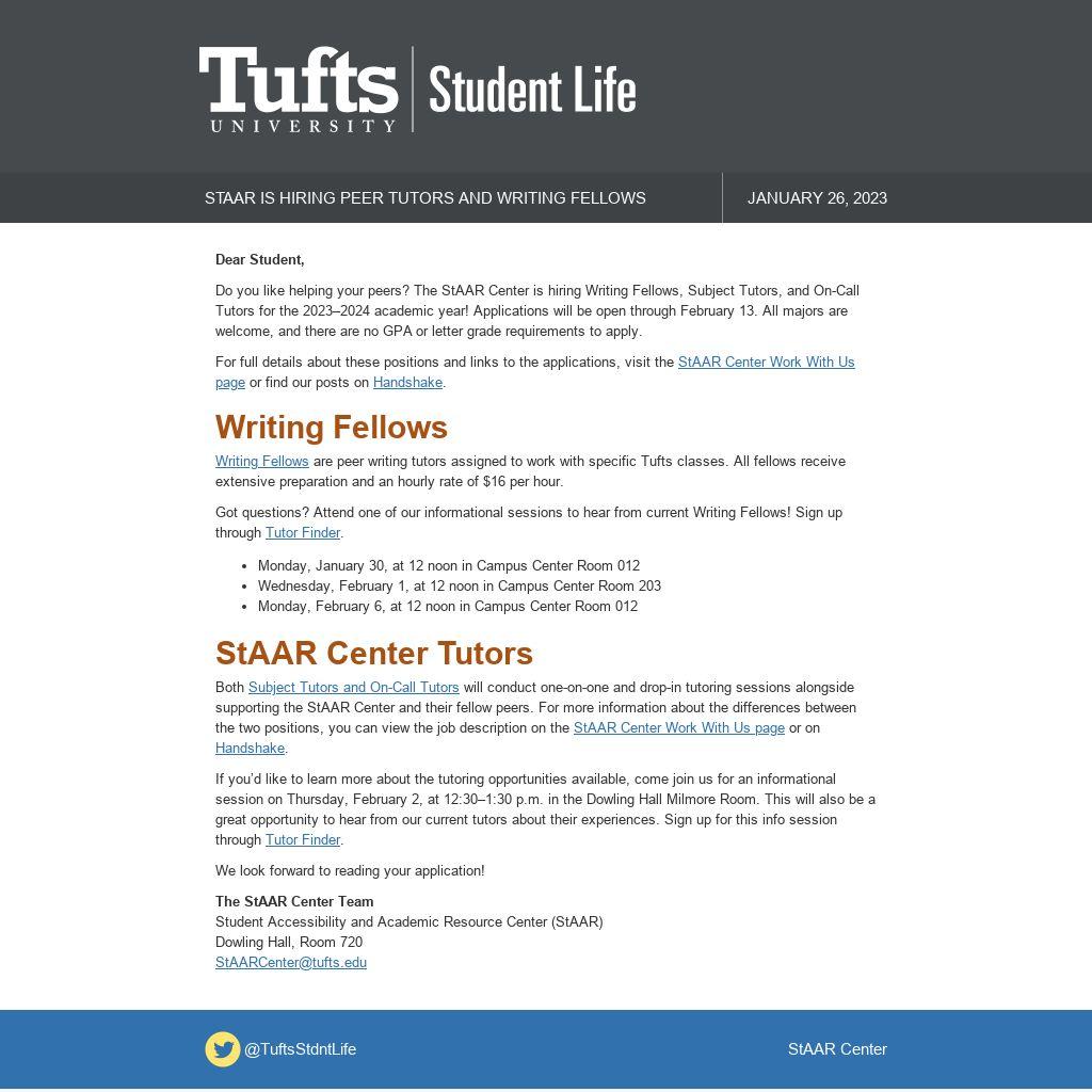 Do you like helping your peers? The StAAR Center is hiring Writing Fellows, Subject Tutors, and On-Call Tutors for the 2023–2024 academic year! Applications will be open through February 13. All majors are welcome, and there are no GPA or letter grade requirements to apply.
