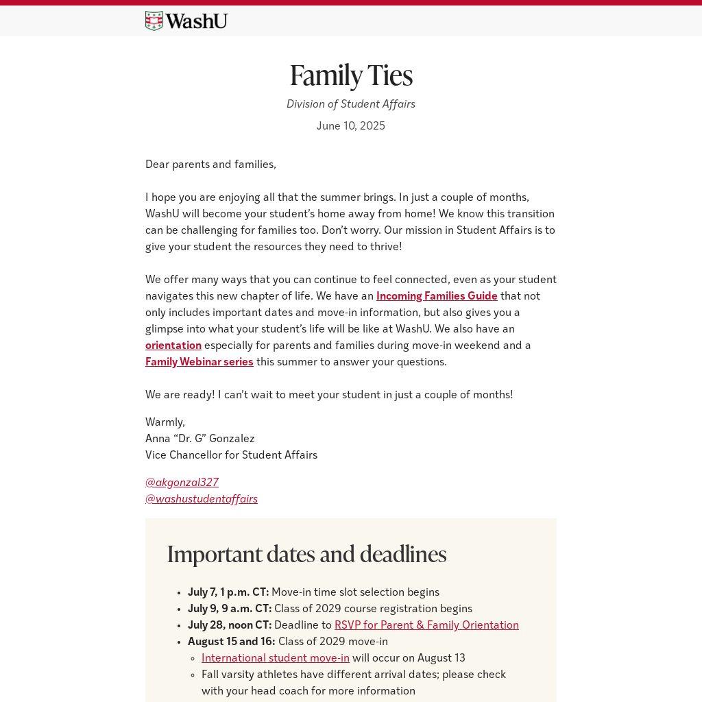 I hope you are enjoying all that the summer brings. In just a couple of months, WashU will become your student’s home away from home! We know this transition can be challenging for families too. Don’t worry. Our mission in Student Affairs is to give your student the resources they need to thrive!