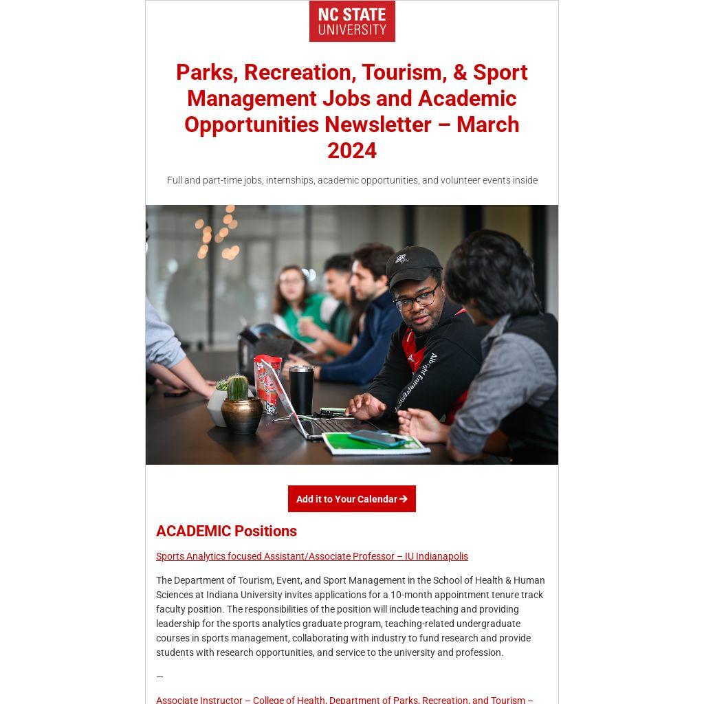 Parks, Recreation, Tourism, & Sport Management Jobs and Academic Opportunities Newsletter – March 2024