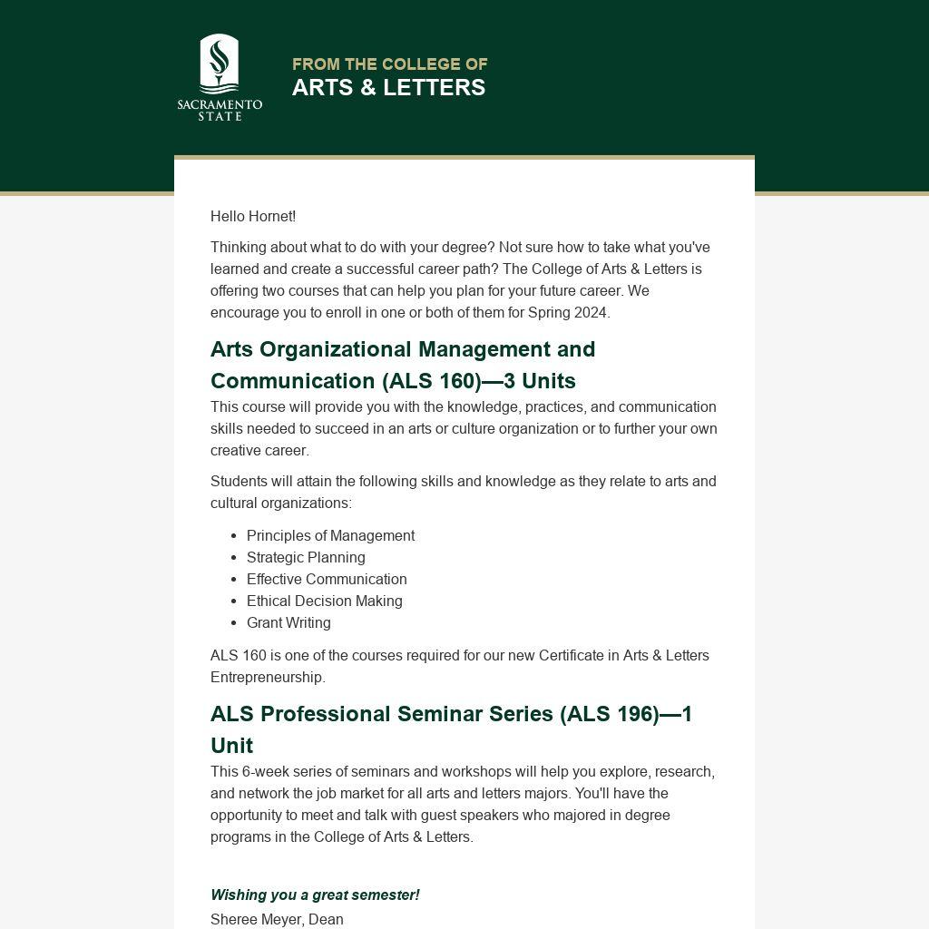 Thinking about what to do with your degree? Not sure how to take what you've learned and create a successful career path? The College of Arts & Letters is offering two courses that can help you plan for your future career. We encourage you to enroll in one or both of them for Spring 2024.