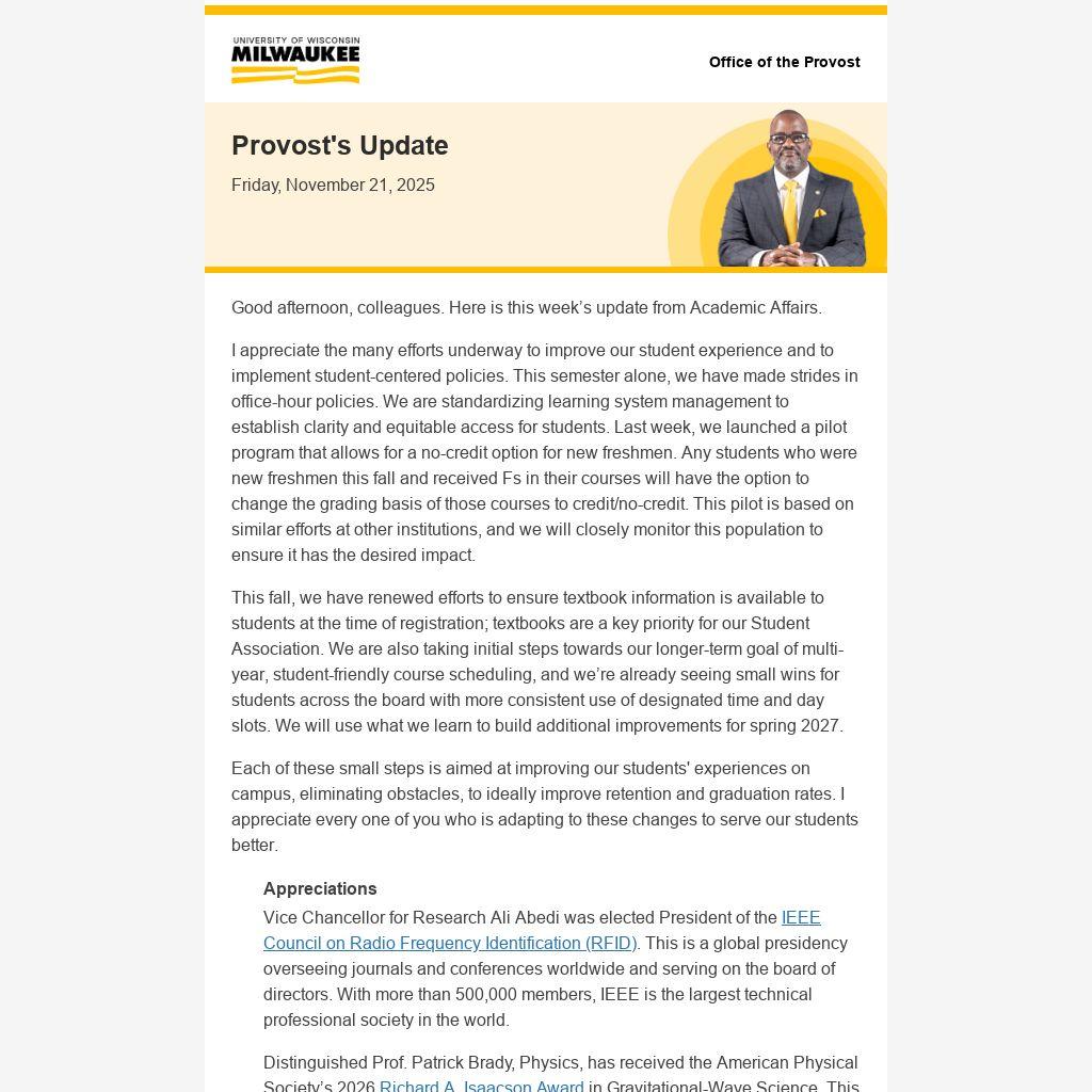 Good afternoon, colleagues. Here is this week’s update from Academic Affairs.