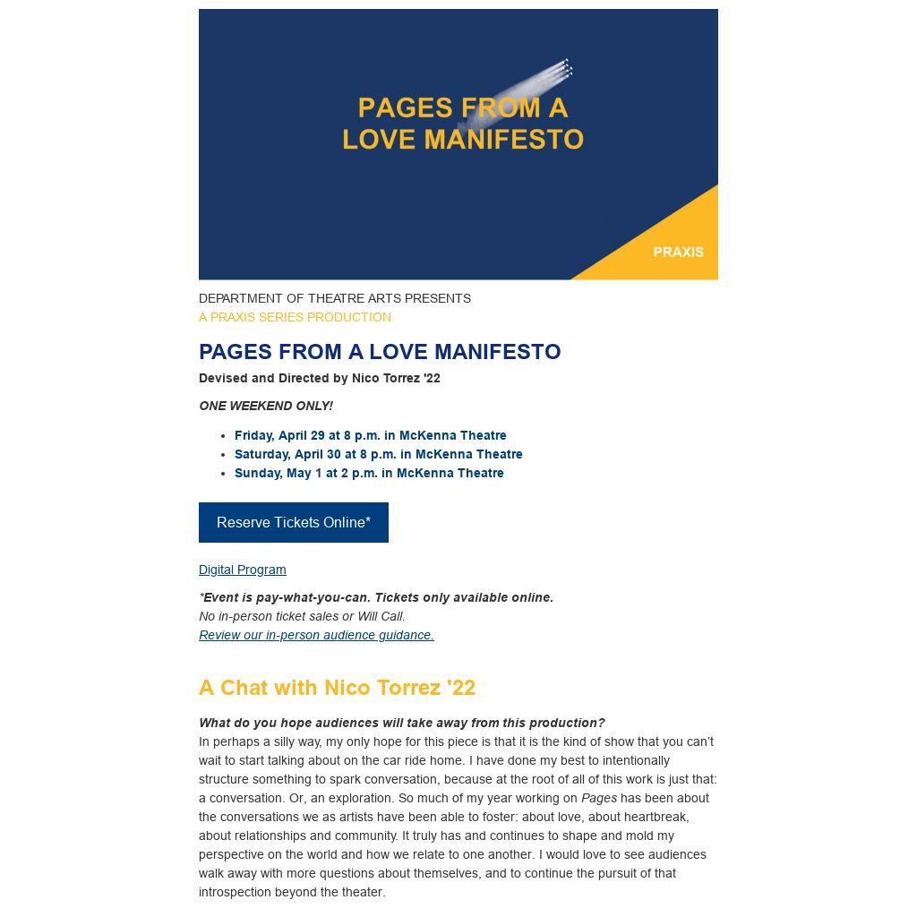 Recent credits include Grounded, Tell Them Tomorrow (director), The Wolves, Cadillac Crew (assistant director), and The Killing Fields (Dramaturg). They’ve been featured in The American Theatre Wing’s docu-series Working in the Theatre and have had the opportunity to work at SUNY New Paltz as a theatre studies intern, thanks to the Hitz Foundation. Pages From a Love Manifesto, their senior thesis project, is their first devising/playwriting credit.