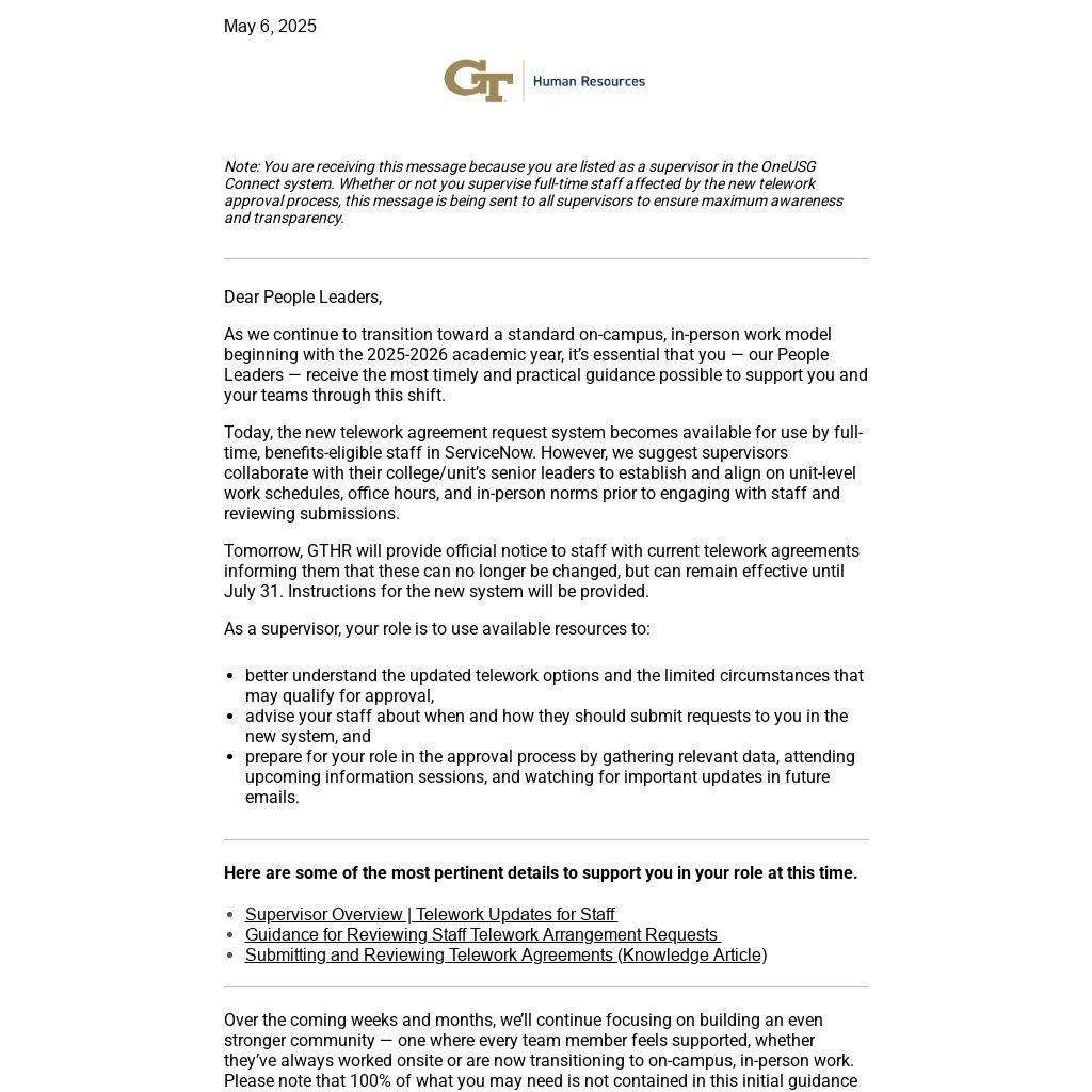 Tomorrow, GTHR will provide official notice to staff with current telework agreements informing them that these can no longer be changed, but can remain effective until July 31. Instructions for the new system will be provided.