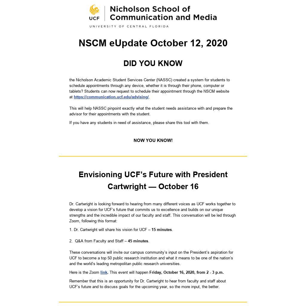 Dr. Cartwright is looking forward to hearing from many different voices as UCF works together to develop a vision for UCF’s future that commits us to excellence and builds on our unique strengths and the incredible impact of our faculty and staff. This conversation will be led through Zoom, following this format: