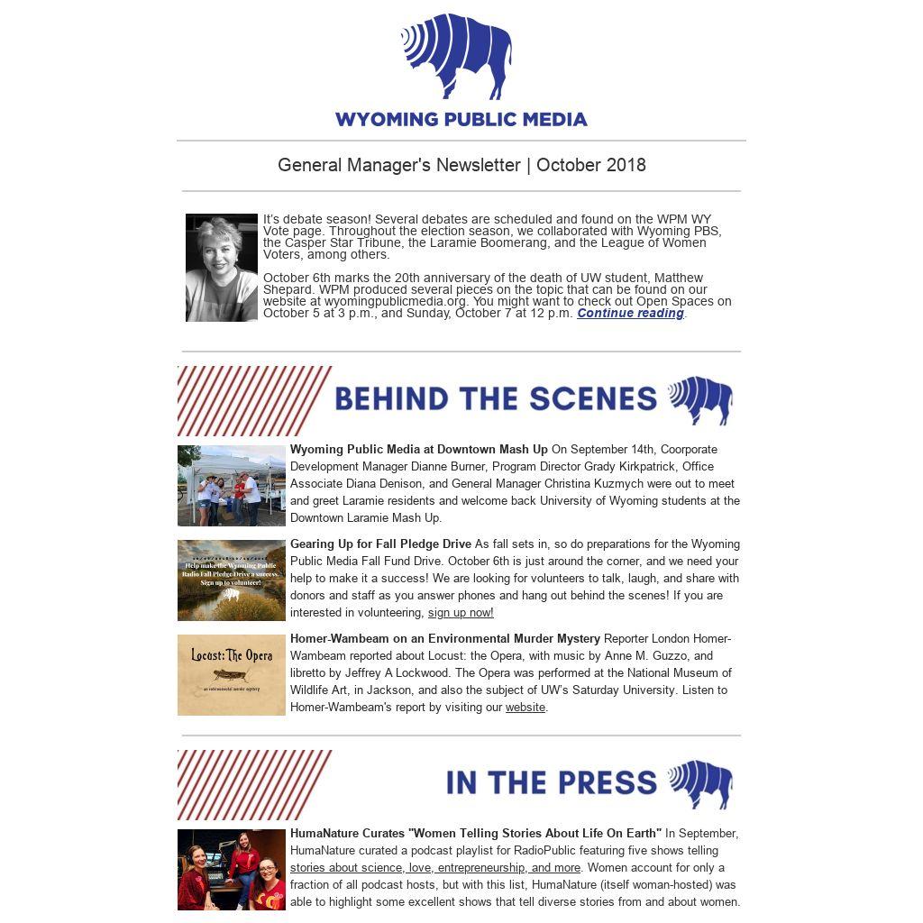 Gearing Up for Fall Pledge Drive As fall sets in, so do preparations for the Wyoming Public Media Fall Fund Drive. October 6th is just around the corner, and we need your help to make it a success! We are looking for volunteers to talk, laugh, and share with donors and staff as you answer phones and hang out behind the scenes! If you are interested in volunteering, sign up now!