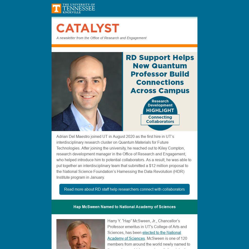 Adrian Del Maestro joined UT in August 2020 as the first hire in UT’s interdisciplinary research cluster on Quantum Materials for Future Technologies. After joining the university, he reached out to Kiley Compton, research development manager in the Office of Research and Engagement, who helped introduce him to potential collaborators. As a result, he was able to put together an interdisciplinary team that submitted a $12 million proposal to the National Science Foundation’s Harnessing the Data Revolution (HDR) Institute program in January.