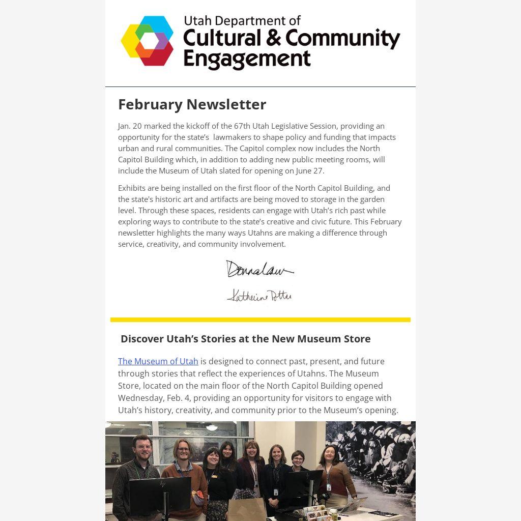 Exhibits are being installed on the first floor of the North Capitol Building, and the state's historic art and artifacts are being moved to storage in the garden level. Through these spaces, residents can engage with Utah’s rich past while exploring ways to contribute to the state’s creative and civic future. This February newsletter highlights the many ways Utahns are making a difference through service, creativity, and community involvement.