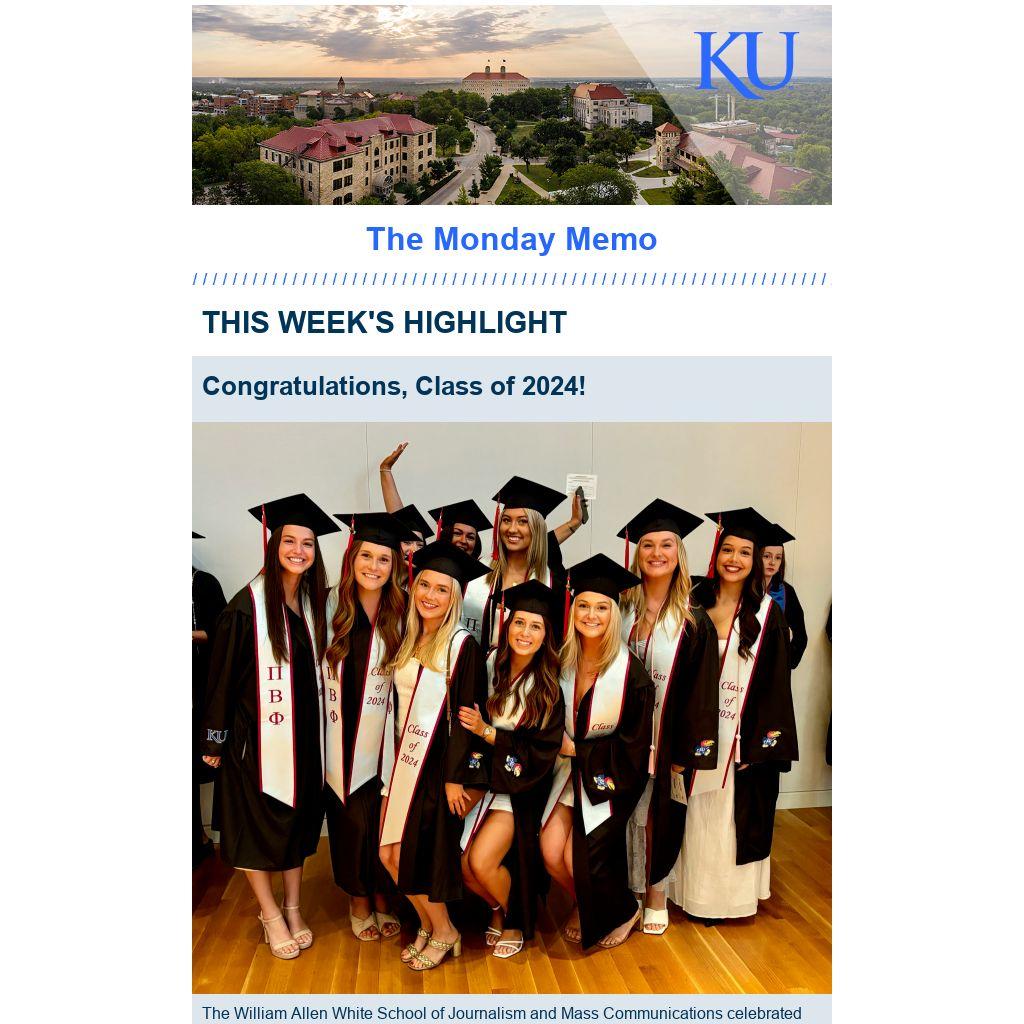 The William Allen White School of Journalism and Mass Communications celebrated doctoral, master’s and bachelor’s degree graduates on Saturday, May 11 at the Lied Center. After the ceremony, graduates and families attended a reception at Stauffer-Flint Hall. A recording of the ceremony is available on the Lied Center website. See the list of 2024 graduates, a photo gallery and a video of graduates signing the alma mater.