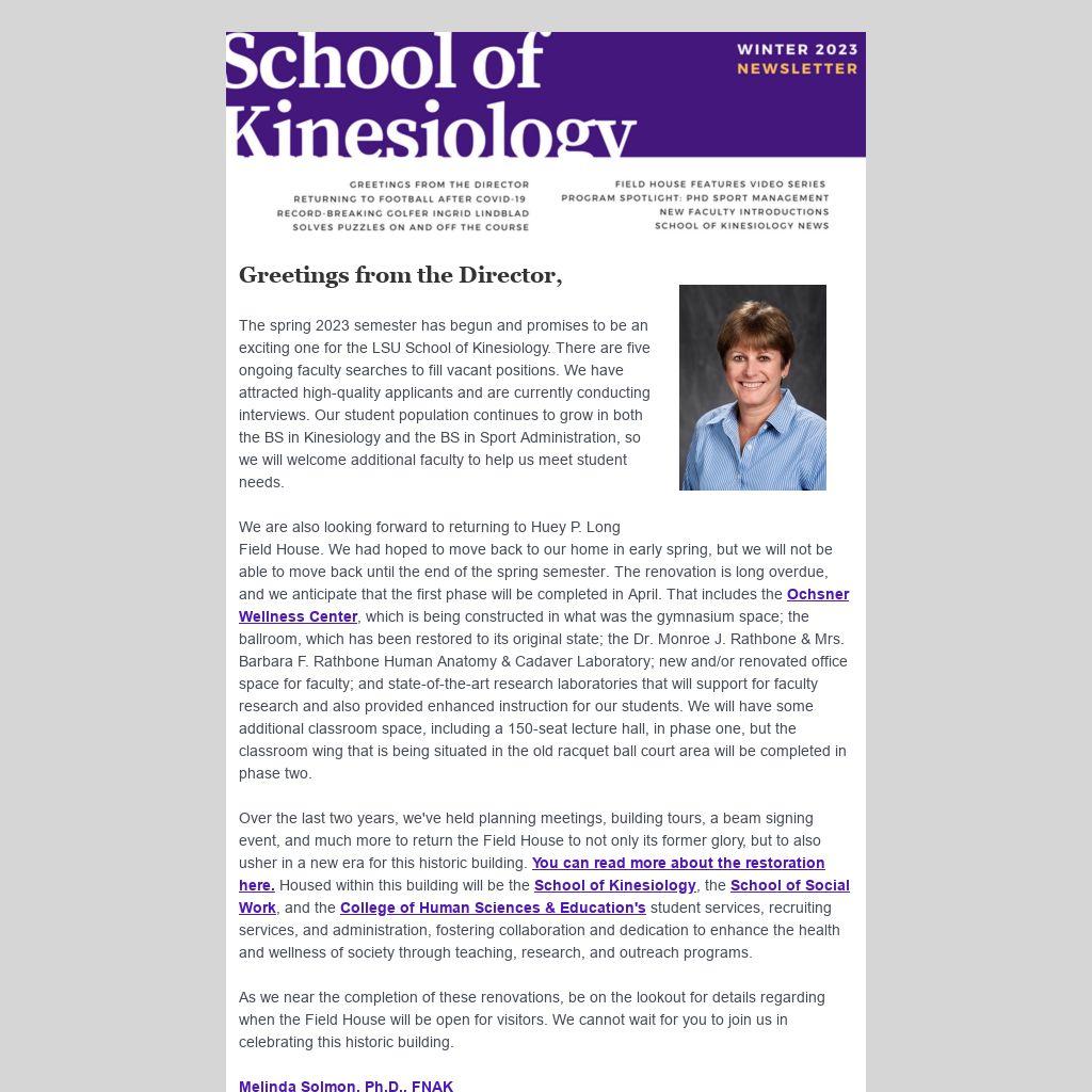 Greetings from the Director, The spring 2023 semester has begun and promises to be an exciting one for the LSU School of Kinesiology. There are five ongoing faculty searches to fill vacant positions. We have attracted high-quality applicants and are currently conducting interviews. Our student population continues to grow in both the BS in Kinesiology and the BS in Sport Administration, so we will welcome additional faculty to help us meet student needs.