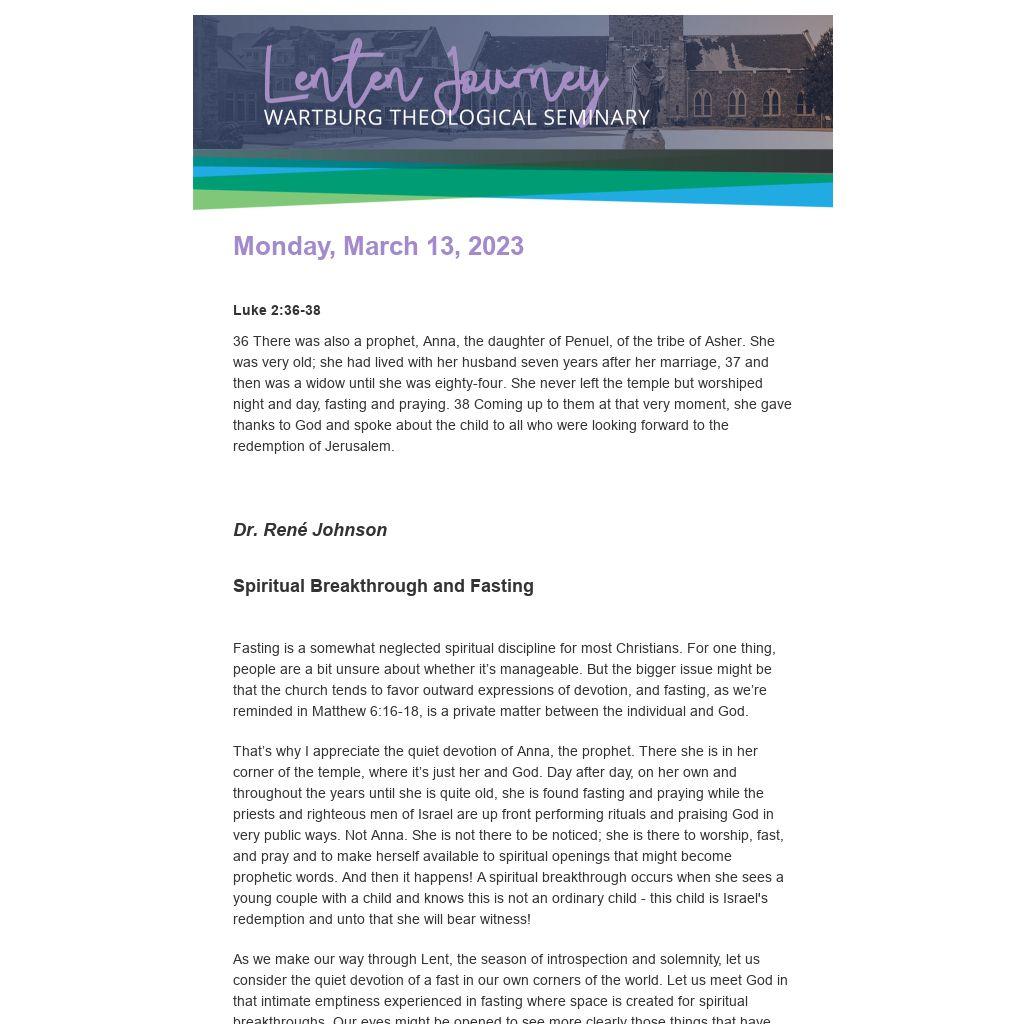 As we make our way through Lent, the season of introspection and solemnity, let us consider the quiet devotion of a fast in our own corners of the world. Let us meet God in that intimate emptiness experienced in fasting where space is created for spiritual breakthroughs. Our eyes might be opened to see more clearly those things that have control over us, our compulsions. We might sense an increased capacity to love and embrace others as they are. Or, we might even see the extraordinary in the ordinary. Whatever it is, like Anna, we will likely see things we can’t stop telling others about.