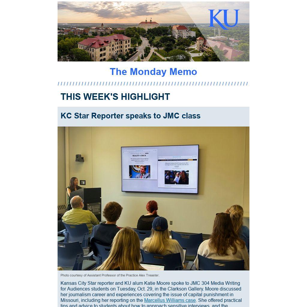 Kansas City Star reporter and KU alum Katie Moore spoke to JMC 304 Media Writing for Audiences students on Tuesday, Oct. 29, in the Clarkson Gallery. Moore discussed her journalism career and experiences covering the issue of capital punishment in Missouri, including her reporting on the Marcellus Williams case. She offered practical tips and advice to students about how to approach sensitive interviews, and the importance of empathy and persistence in reporting.