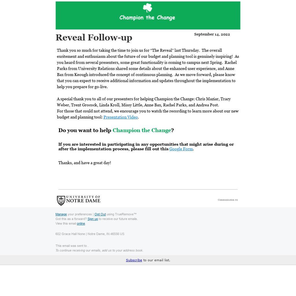 Thank you so much for taking the time to join us for “The Reveal” last Thursday. The overall excitement and enthusiasm about the future of our budget and planning tool is genuinely inspiring! As you heard from several presenters, some great functionality is coming to campus next Spring. Rachel Parks from University Relations shared some details about the enhanced user experience, and Anne Bax from Keough introduced the concept of continuous planning. As we move forward, please know that you can expect to receive additional information and updates throughout the implementation to help you prepare for go-live.