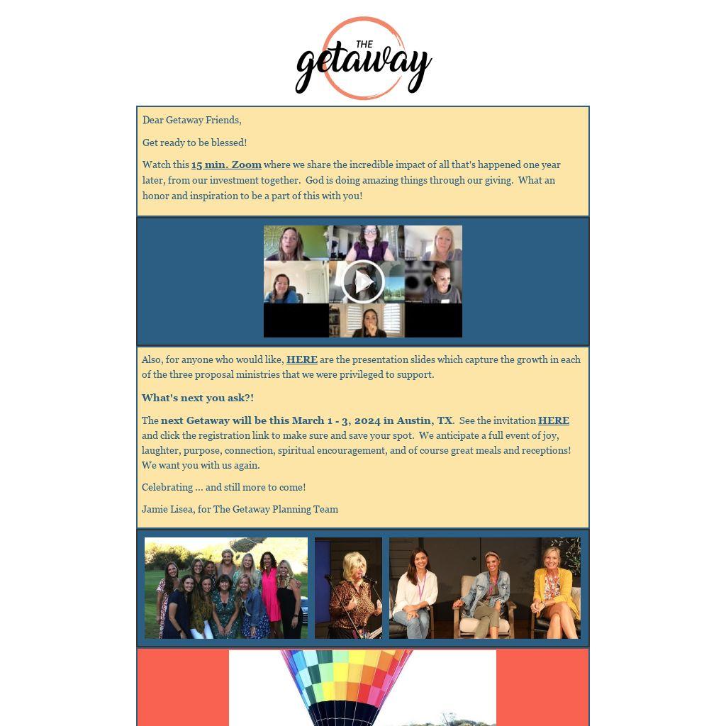 The next Getaway will be this March 1 - 3, 2024 in Austin, TX. See the invitation HERE and click the registration link to make sure and save your spot. We anticipate a full event of joy, laughter, purpose, connection, spiritual encouragement, and of course great meals and receptions! We want you with us again.