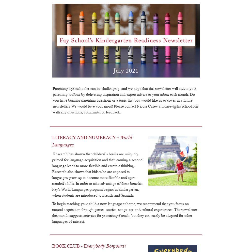 Research has shown that children’s brains are uniquely primed for language acquisition and that learning a second language leads to more flexible and creative thinking. Research also shows that kids who are exposed to languages grow up to become more flexible and open-minded adults. In order to take advantage of these benefits, Fay's World Languages program begins in kindergarten, when students are introduced to French and Spanish.